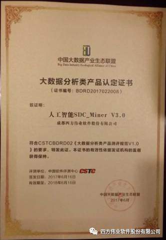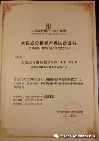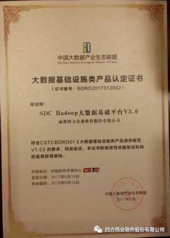 本次峰會(huì)發(fā)布了第二批中國優(yōu)秀大數(shù)據(jù)產(chǎn)品與解決方案測(cè)評(píng)結(jié)果,四方偉業(yè)的SDC Hadoop大數(shù)據(jù)基礎(chǔ)平臺(tái)、SDC Miner大數(shù)據(jù)人工智能平臺(tái)和SDC UE大數(shù)據(jù)可視化設(shè)計(jì)軟件共3項(xiàng)大數(shù)據(jù)產(chǎn)品通過測(cè)評(píng),分別獲得大數(shù)據(jù)基礎(chǔ)設(shè)施類、分析類產(chǎn)品認(rèn)定證書。